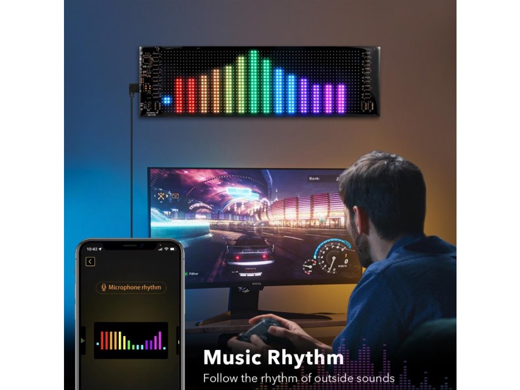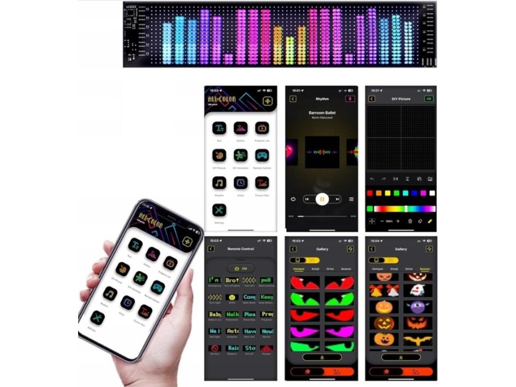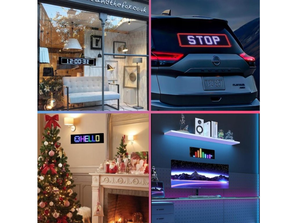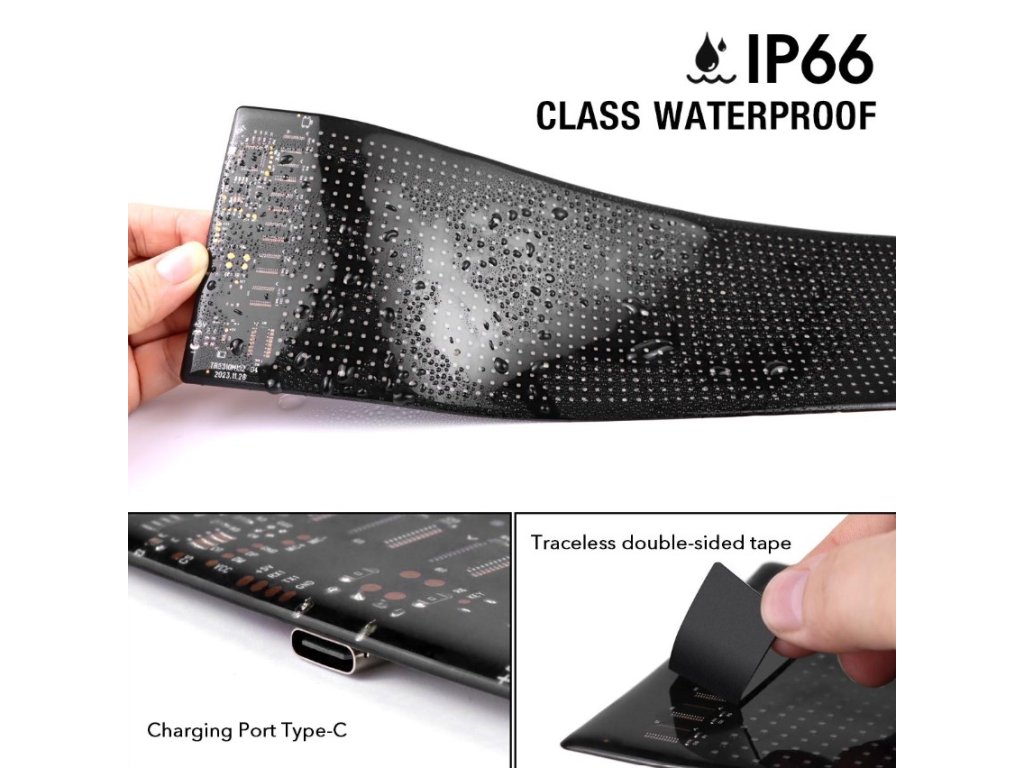 RGB LED Matrix Panel s LED diodami. Rozměr 20 x 60 cm. Celý panel je vyroben z umělých materiálů, takže je vysoce flexibilní a odolný vůči ohybům. Svícení je možné ovládat přes přibalený ovladač, nebo pomocí mobilní aplikaci, kde je také možné vytvářet své vlastní nápisy a designy. Napájení pomocí USB, kabel součástí balení.