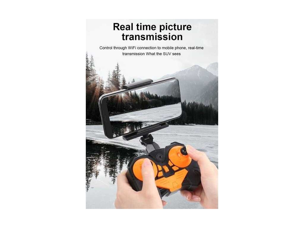 Dálkové ovládání má speciální držák na telefon, díky kterému můžete sledovat živý obraz z kamery vozidla, fotit a dokonce i nahrávat videa!
