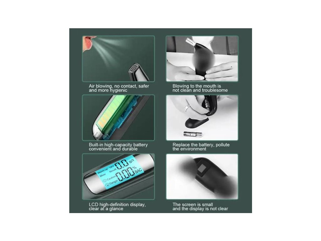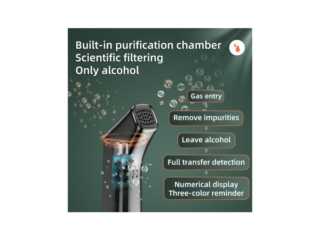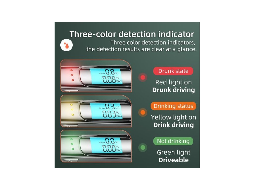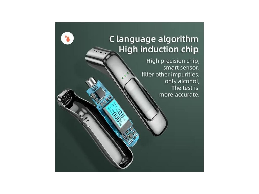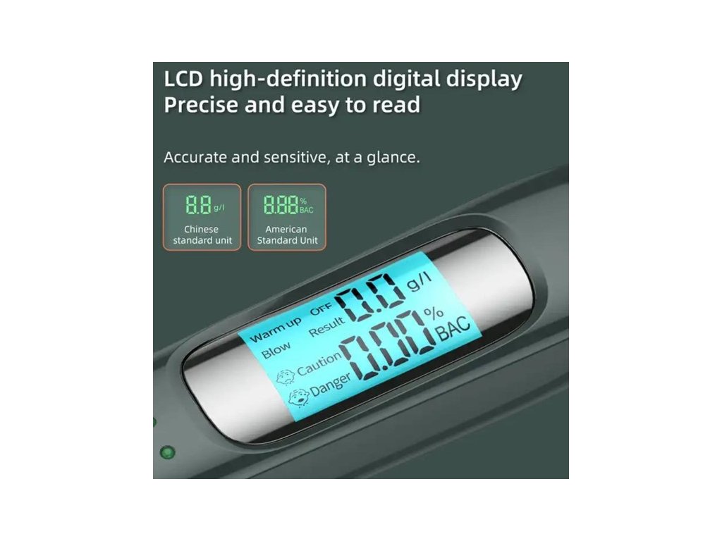 Zkouškou lze, za pomoci polovodičového kyslíkového čidla, zjistit obsah alkoholu v krvi s rozsahem měření 0 - 1,9‰. Vybavení přístroje je rozšířeno o zvukovou výstrahu a digitální podsvícený displej, na kterém se přehledně zobrazují naměřené hodnoty.