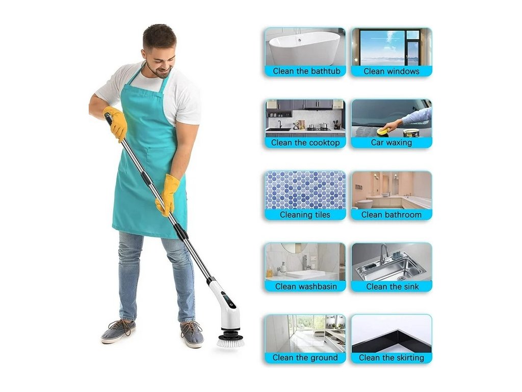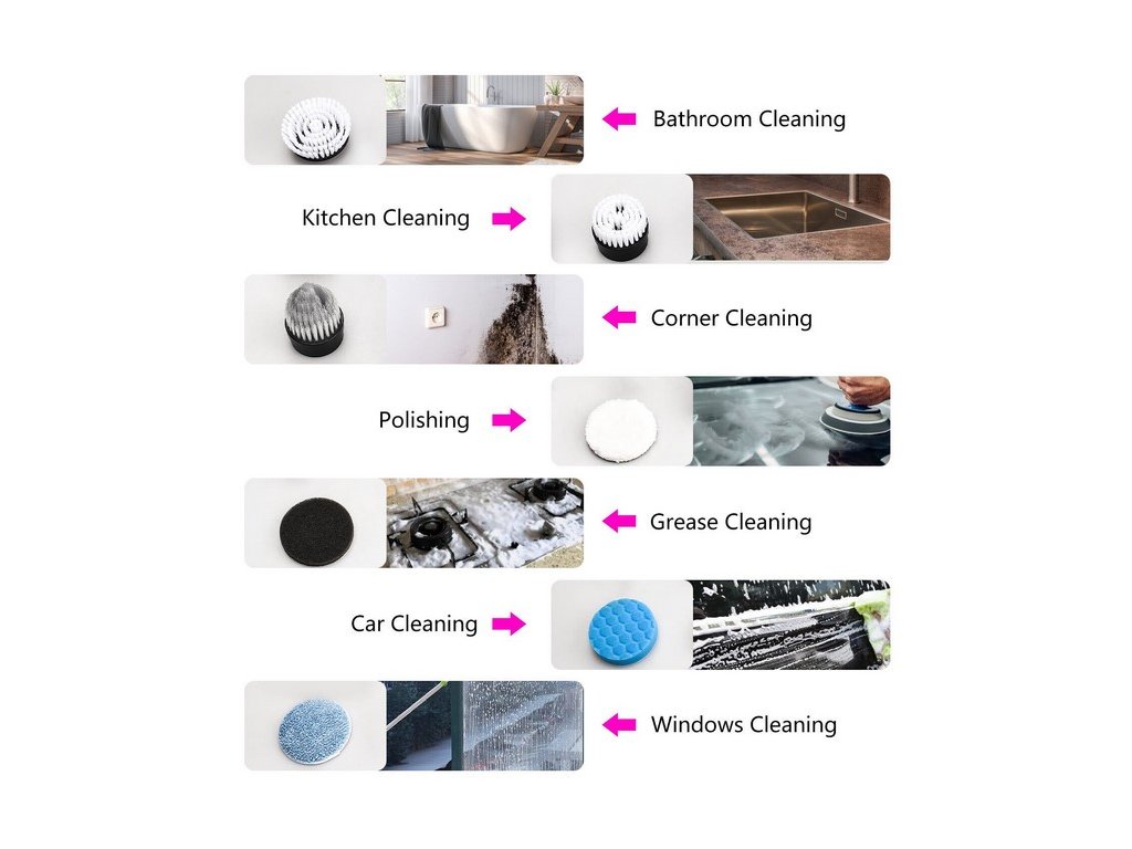 Multifunkční kartáčová hlava 7 v 1. Tento elektrický kartáč je vybaven 7 výměnnými kartáčovými hlavami, které účinně odstraňují různé druhy nečistot a prachu. Plochý kartáč je ideální na povrchy, jako jsou dlaždice, stěny a bazény. Rohový kartáč slouží k čištění spár, armatur a hran. Látkový kartáč je ideální pro dřevěné podlahy a nábytek, zatímco houbový kartáč je vynikající pro čištění oken.
