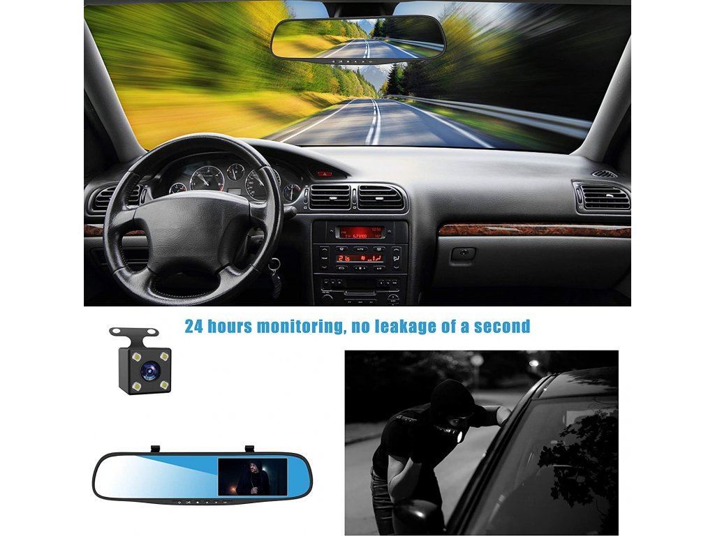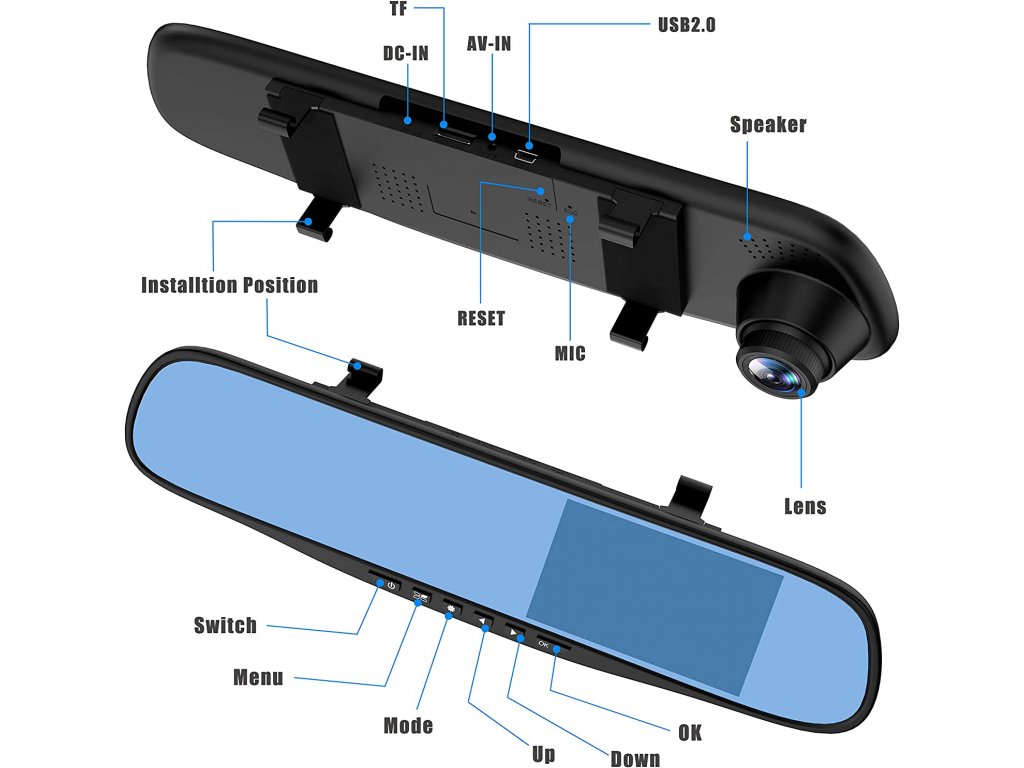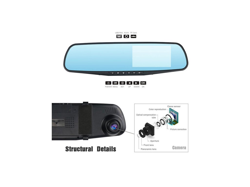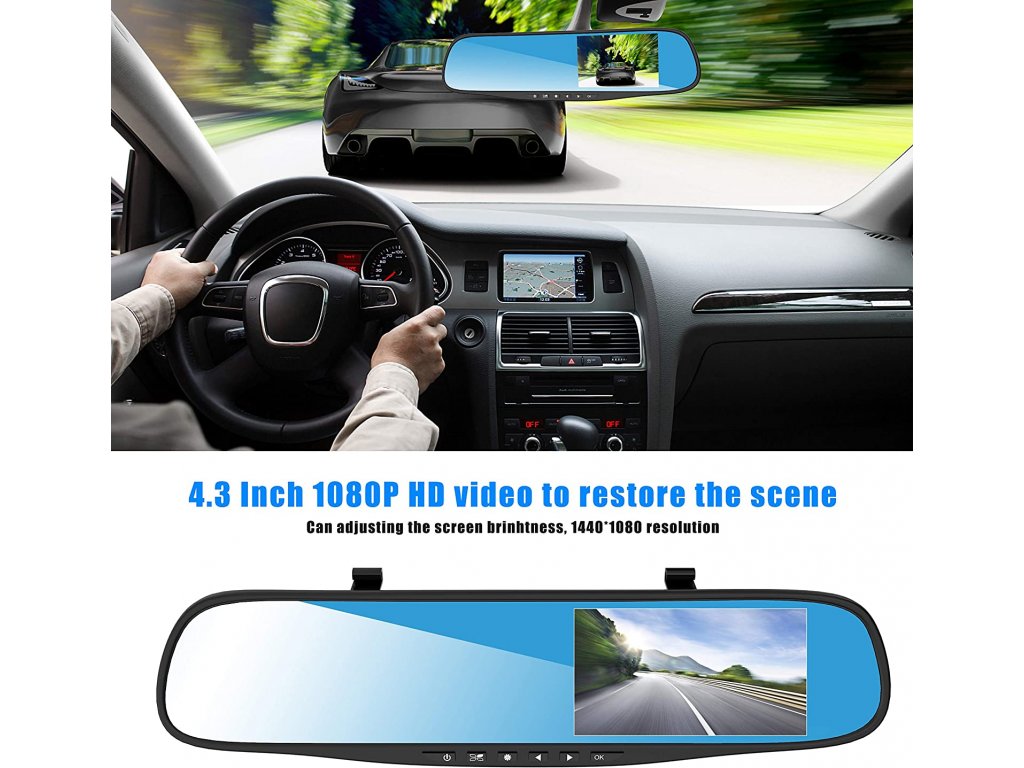 Kamera ve zpětném zrcátku + přídavná kamera + 5m dlouhý kabel - instalace této Autokamera ve zpětném zrcátku je poměrně jednoduchá stačí když ji připevníte pomocí svorek na Vaše původní zpětné zrcátko. 1/3 části zrcadla tvoří barevný 4,3 "TFT LCD monitor. kamera s širokoúhlým objektivem 170 ° zaznamenává video se zvukem v HD 1080p rozlišení. Druhou kameru můžete upevnit k zadní SPZ, nebo do interiéru auta, pro sledování řidiče, příp. pasažérů.