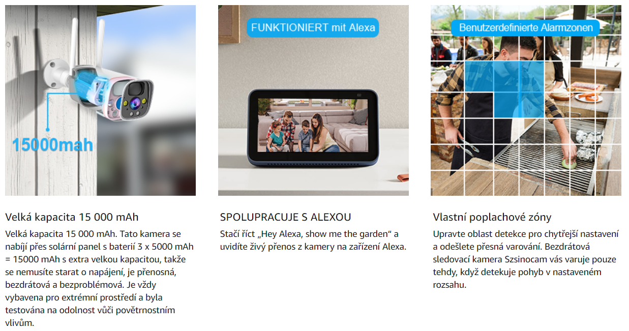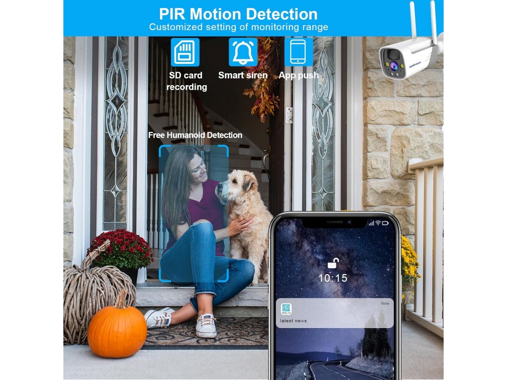AI detekce pohybu a obousměrný zvuk Wifi kamera se solární baterií využívá inteligentní algoritmy umělé inteligence, aby výrazně zlepšila schopnost detekce lidí a snížila počet falešných poplachů způsobených hmyzem a větvemi. Dohledová kamera - Jakmile je detekováno nebezpečí ( pohyb ), IP kamera vám okamžitě zašle upozornění e-mailem a push notifikace na vaše mobilní zařízení. abyste mohli včas reagovat. Lépe chraňte svou rodinu a majetek. PIR detekce pohybu a inteligentní alarm: kamera je vybavena nejnovějším PIR senzorem detekce pohybu. Když si v aplikaci nastavíte časovač, kamera vám pošle varování do telefonu, když zjistí, že někdo vstupuje do monitorovaného prostoru. Kamera je zároveň vybavena LED světly, která nepřetržitě blikají, a reproduktor vydává hlasitý zvuk alarmu, který odradí vetřelce